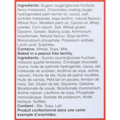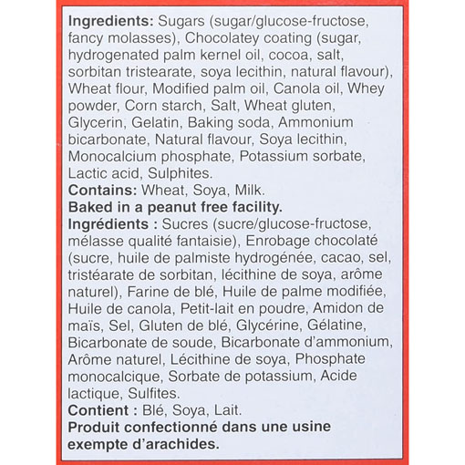 | Ingredients | Chocolatey coating (sugar, hydrogenated modified palm kernel oil, cocoa, salt, sorbitan tristearate, soya lecithin, artificial flavour), wheat flour, glucose-fructose, sugar, modified palm oil, canola oil, whey powder, corn starch, fancy molasses, salt, gelatin, glycerin, baking soda, natural and artificial flavour, ammonium bicarbonate, potassium sorbate, soya lecithin, monocalcium phosphate. |