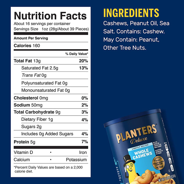 Planters Deluxe Lightly Salted Whole Cashews are a family-favorite snack with a satisfying crunchy texture. These rich nutty cashews are roasted in peanut oil and seasoned with a touch of sea salt for an irresistible treat. Whether you need a comforting snack after dinner or youre hungry for some sustenance between meals, these roasted cashews deliver what you crave. With 50 mg. of sodium per 1 oz. serving, these lightly salted cashews are great for those reducing sodium in their diet.