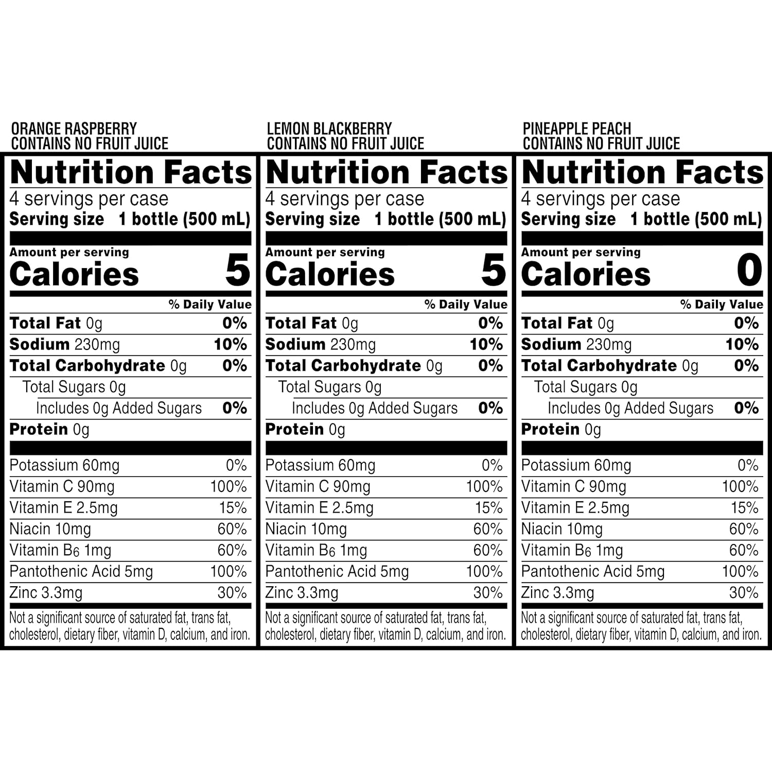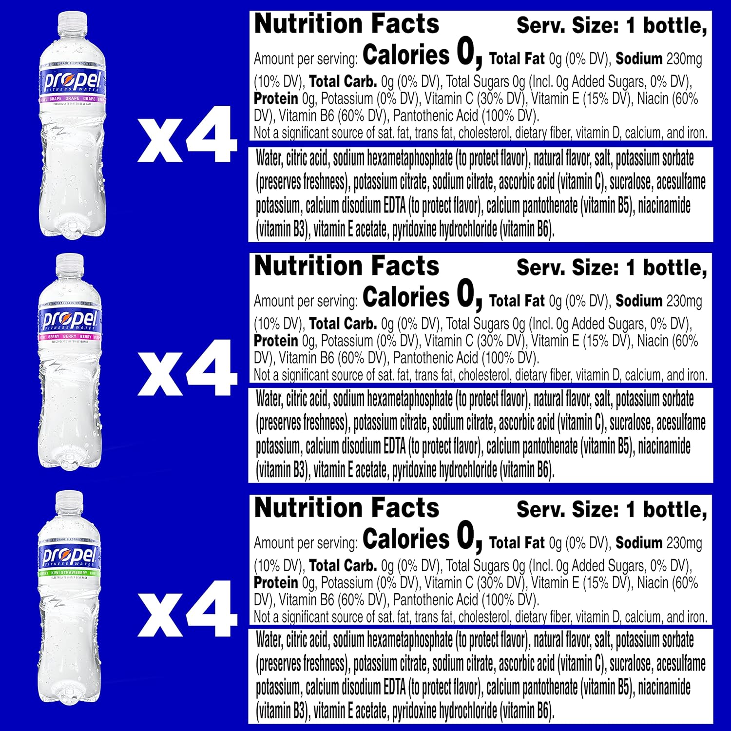 - Propel electrolyte water beverage contains B Vitamins (B3, B5, and B6), and antioxidants Vitamin C and E.